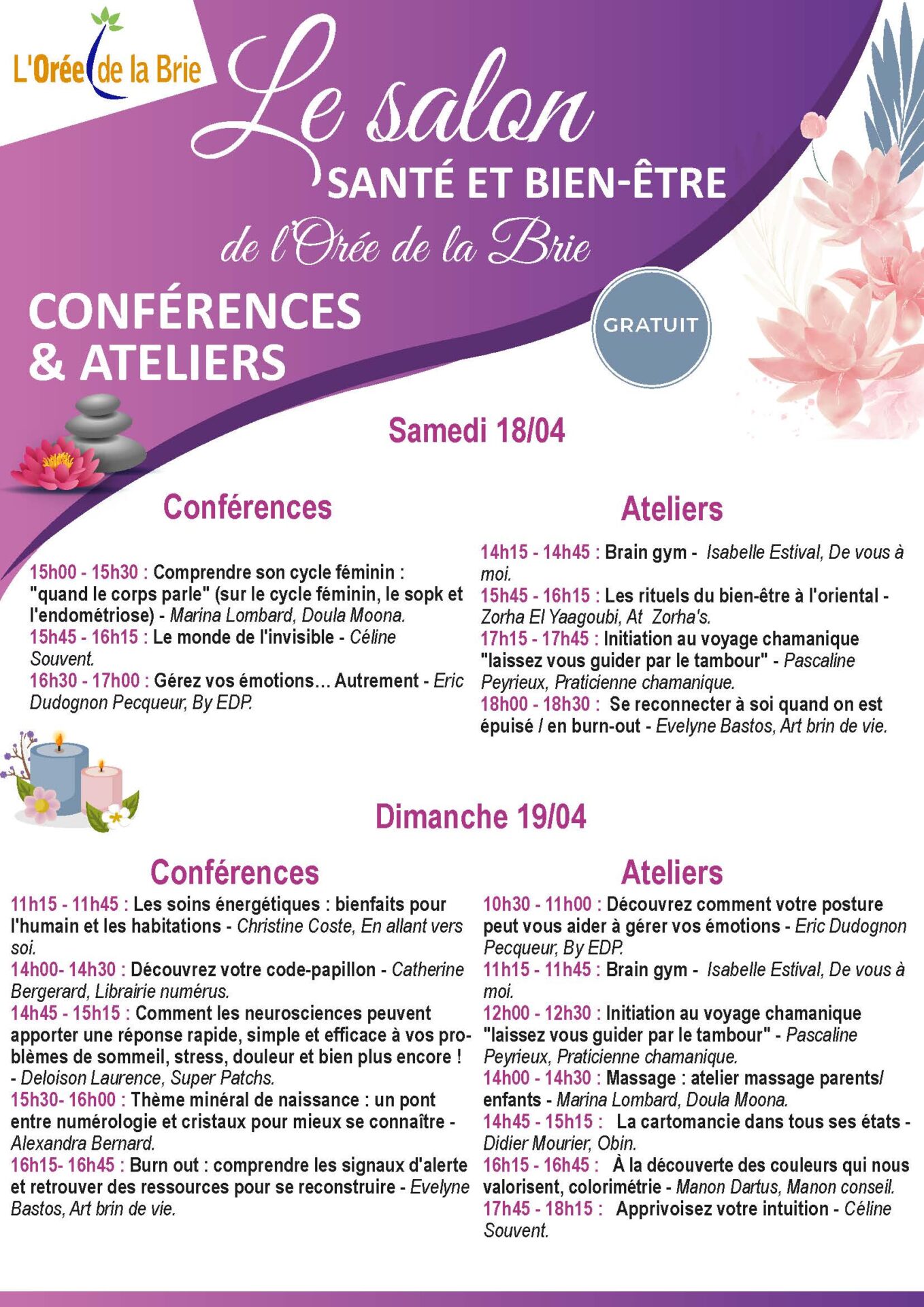 Tout au long du week-end, des démonstrations, ateliers et conférences rythmeront l’événement : méditation, réflexologie, naturopathie et bien d’autres disciplines seront à l’honneur.