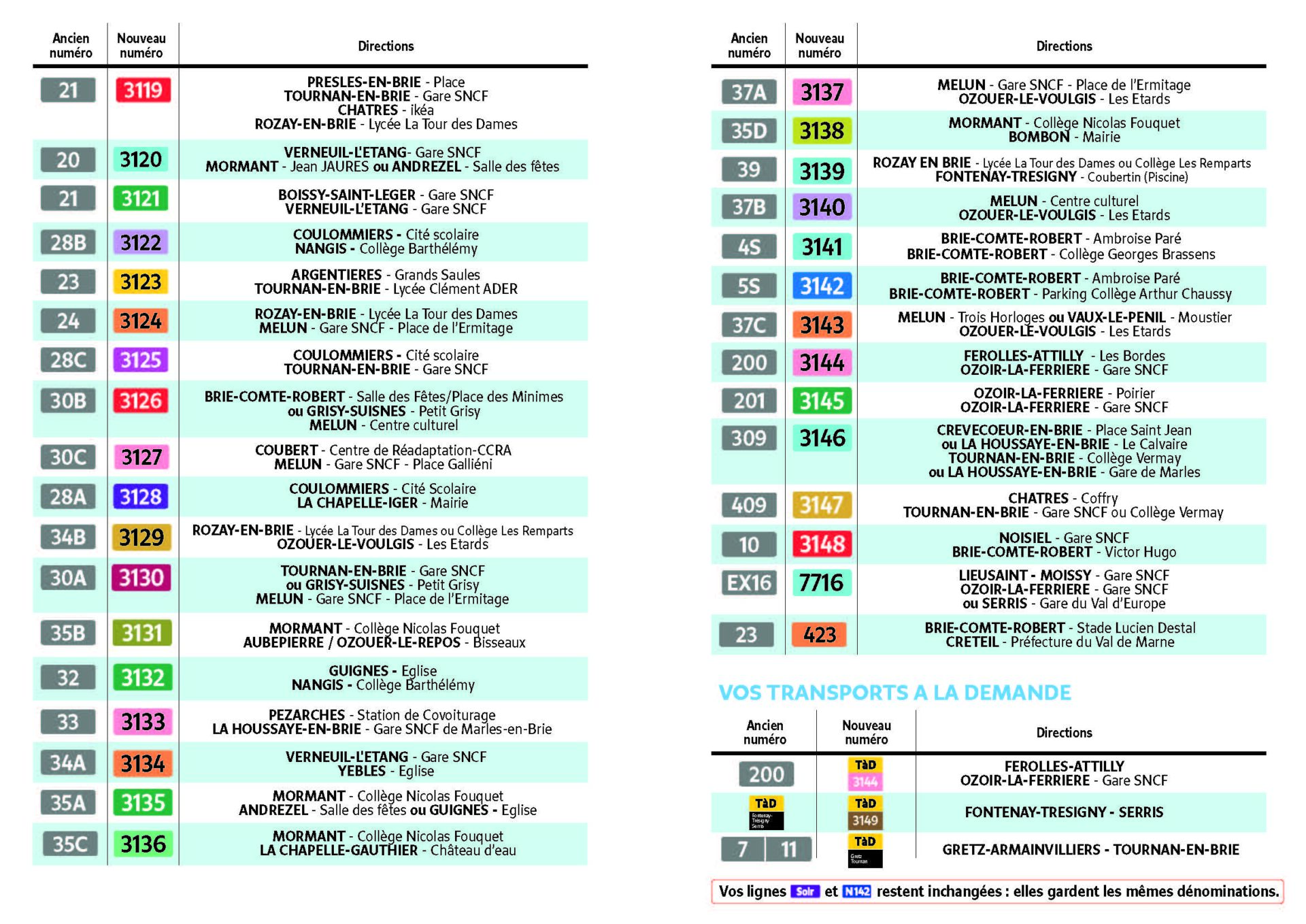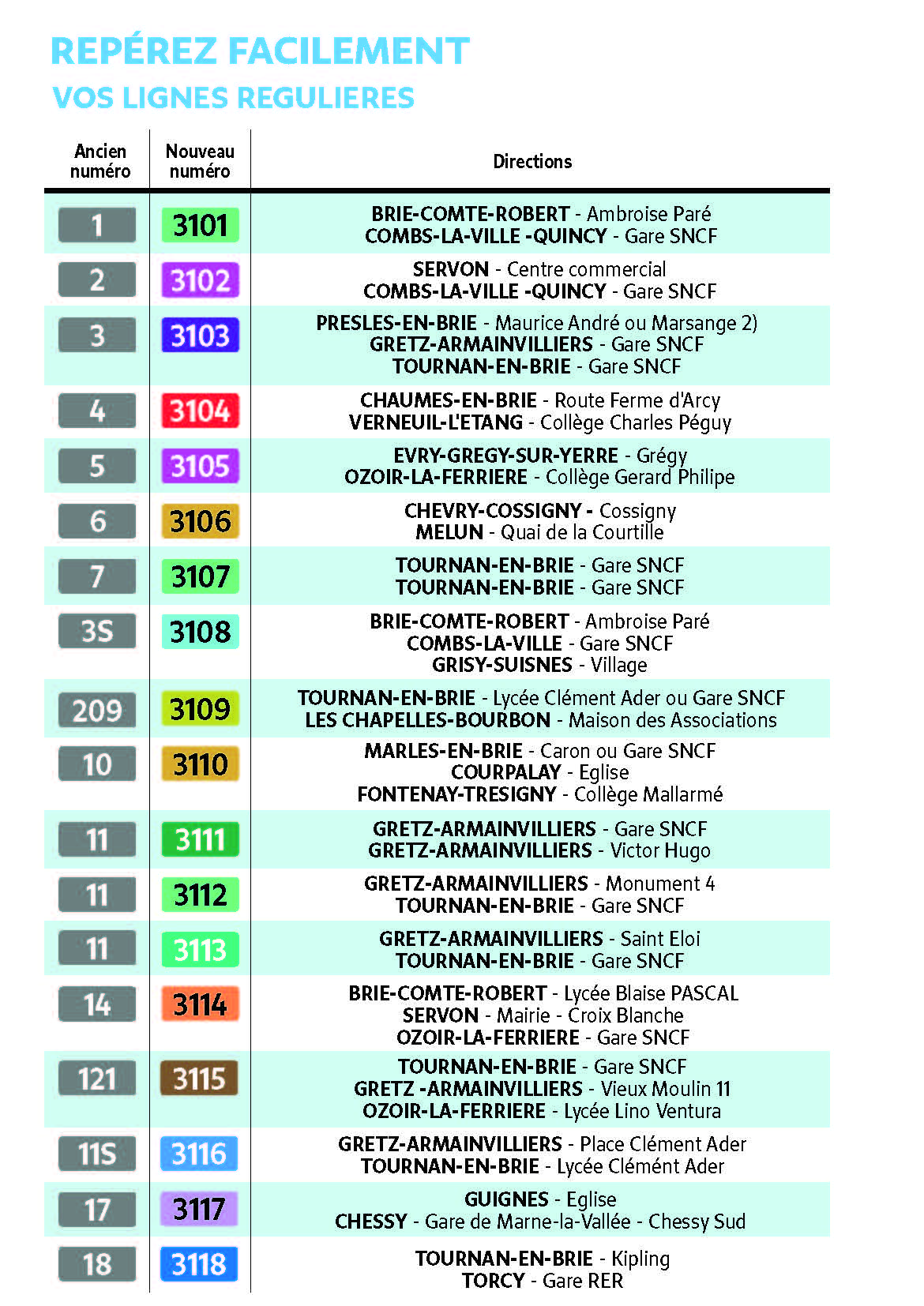 Tableau de renumérotation des lignes de bus du Pays Briard :