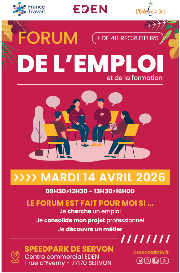 La Communauté de communes de l’Orée de la Brie, en partenariat avec le centre commercial EDEN et France Travail de Brie-Comte-Robert, organise un forum de l’emploi le mardi 14 avril 2026, de 9h30 à 12h30 & de 13h30 à 16h00, au SpeedPark du centre commercial EDEN Cerf à Servon.