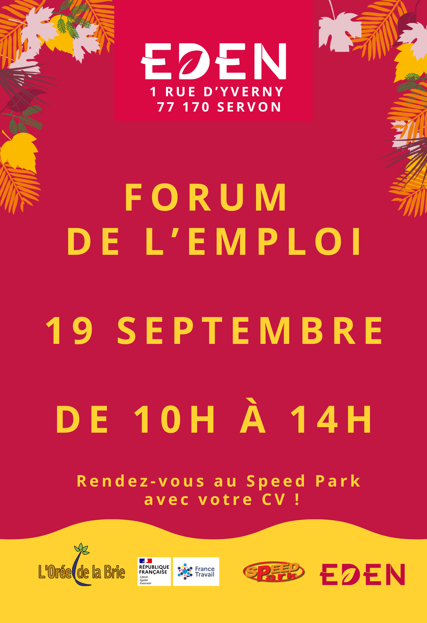 La Communauté de communes de l’Orée de la Brie en partenariat avec Eden Cerf de Servon et France Travail (ex-Pôle emploi) de Brie-Comte-Robert organise un forum de l’emploi au SpeedPark de Servon le jeudi 19 septembre 2024, de 10h00 à 14h00.