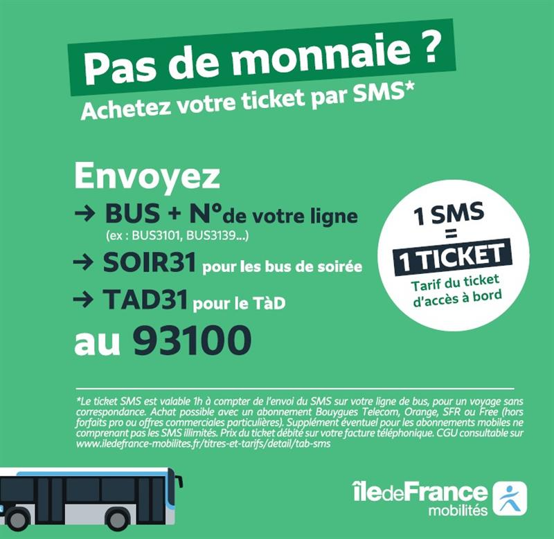 Vous pouvez acheter votre ticket par SMS envoyer « BUS+N° de votre ligne » au 93100 (2,5€ le ticket) Ex : BUS3101