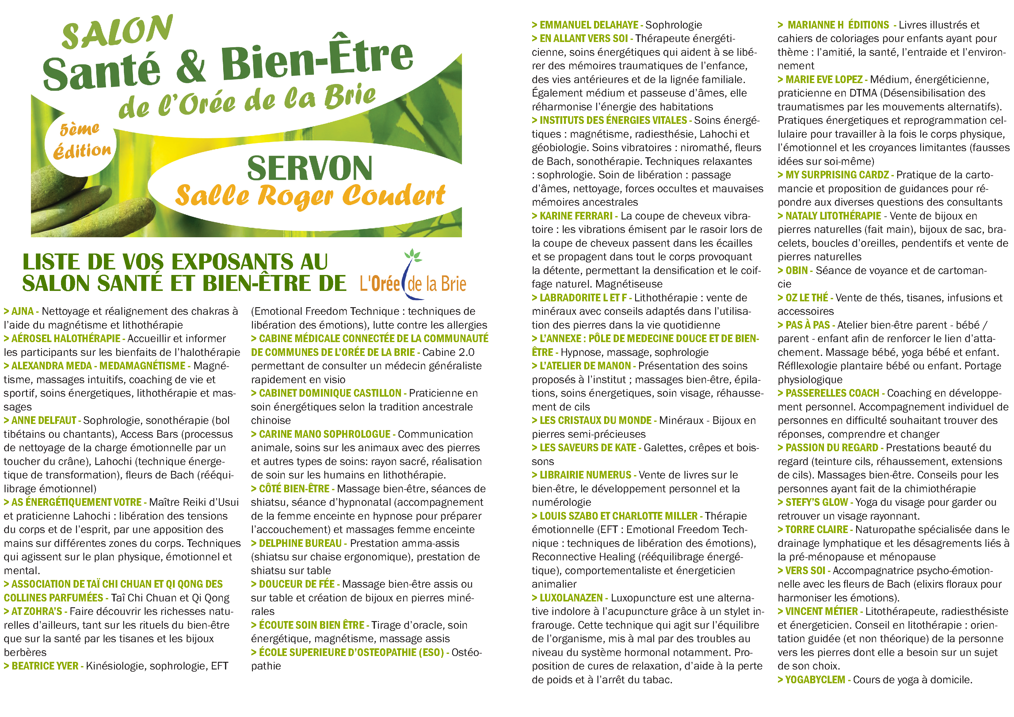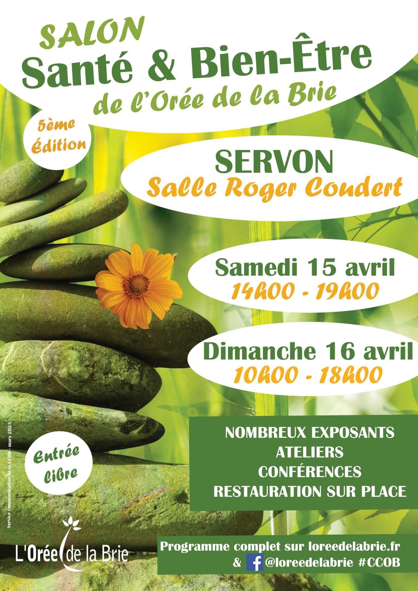 Pour sa 5ème édition, le Salon Santé et Bien-être de la Communauté de communes de l’Orée de la Brie se tiendra à Servon, salle Roger Coudert, les 15 et 16 avril 2023.