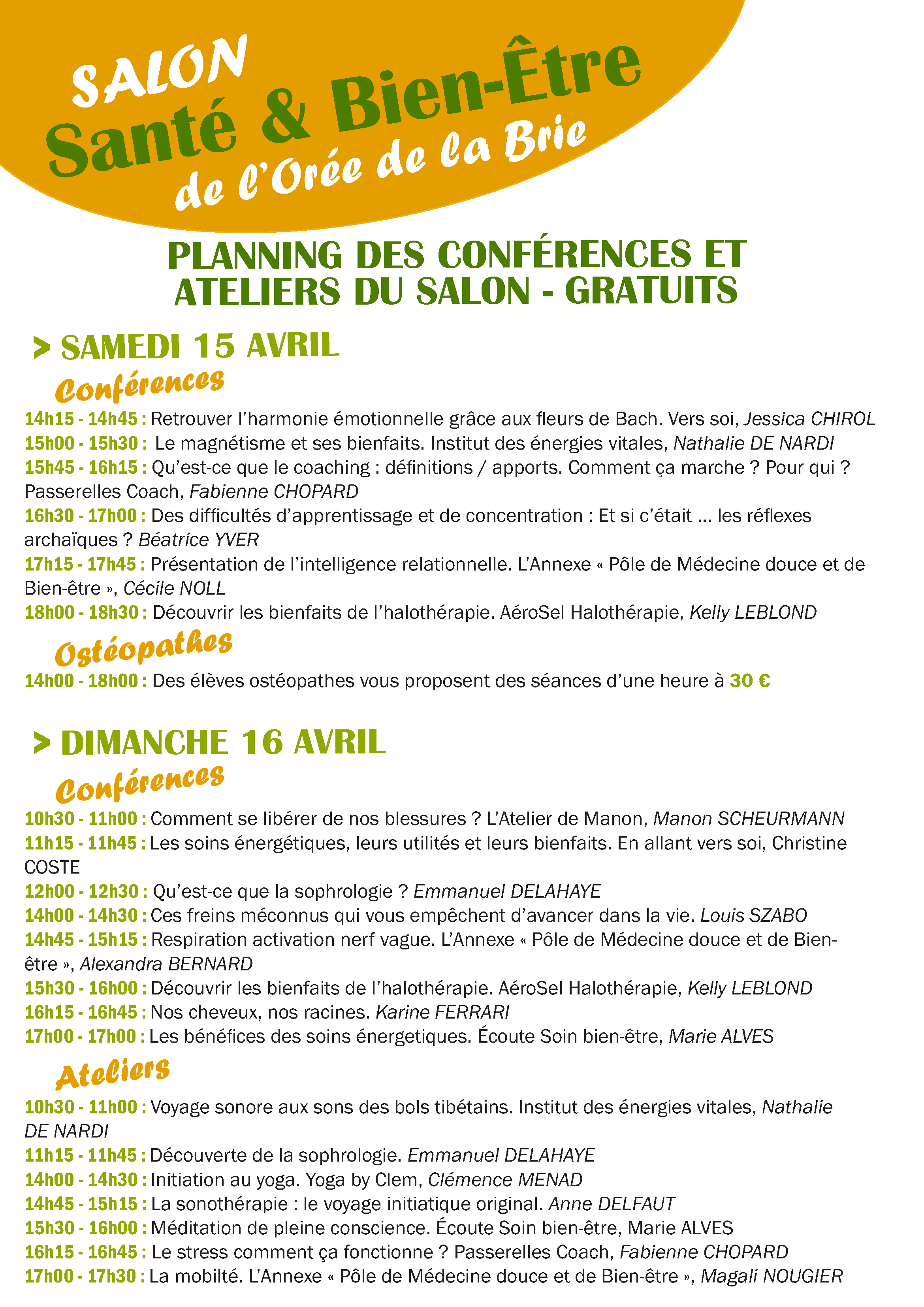 Des démonstrations, des ateliers et des conférences, seront organisés : méditation, réflexologie, naturopathie… Voir le visuel ci-joint.